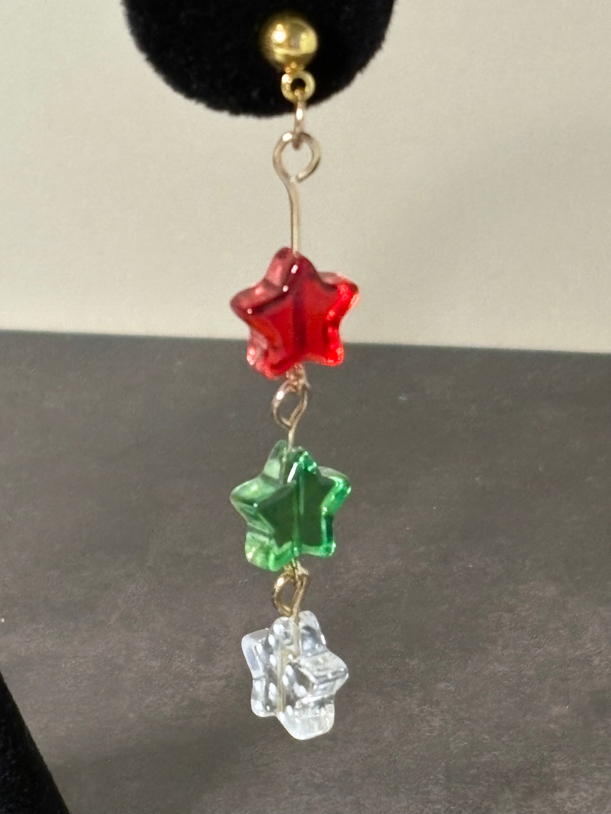 Celebrate the sparkle of the season with these triple star drop earrings, featuring a cascade of red, green, and clear stars. Perfect for holiday parties or adding a touch of cheer to your everyday look, these lightweight dangles capture the magic of twinkling lights and frosty nights—no pearls needed, just pure shimmer.