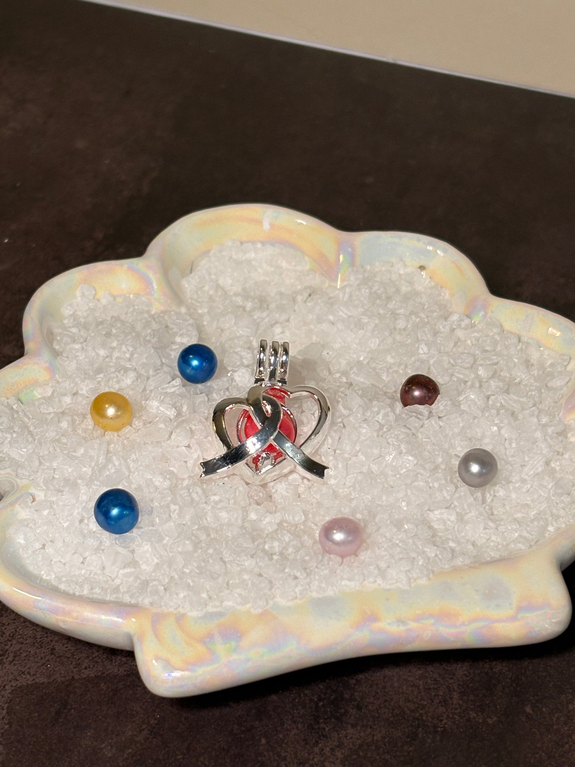 Show your support and carry strength close to your heart. This double heart ribbon pendant cage features two intertwined hearts that form an awareness ribbon design in the center—symbolizing love, unity, and the fight for a cause. Designed to hold a single pearl, it's a beautiful reminder of courage, support, and shared hope.