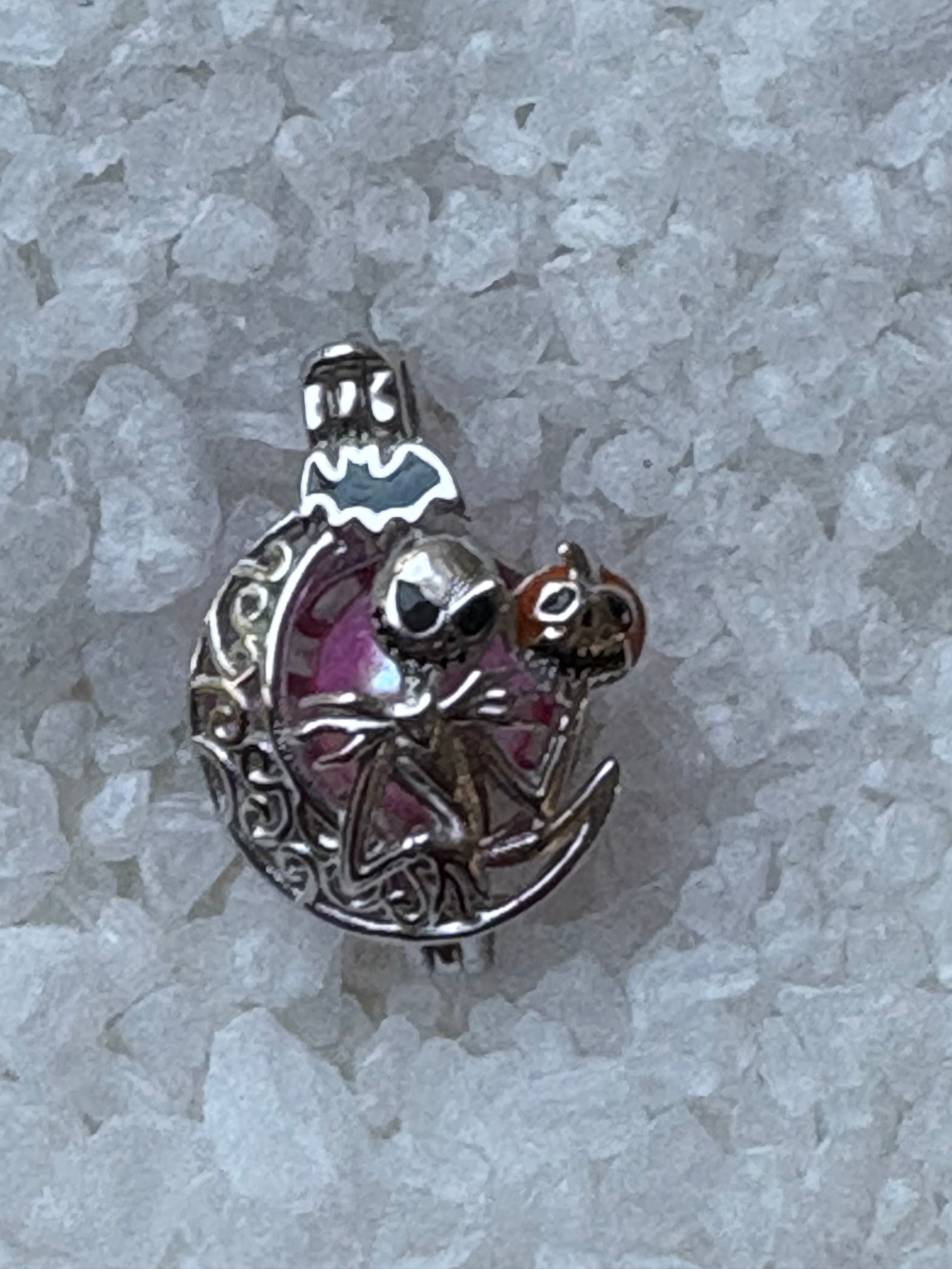 “Whether ’tis nobler in the mind to sparkle…” Celebrate the whimsical charm of Halloween and gothic elegance with this sterling silver pendant cage featuring Jack Skellington holding a mischievous Jack-O’-Lantern. Designed to cradle a luminous pearl, it blends playful mischief, spooky sophistication, and literary flair—perfect for fans of darkly magical style.