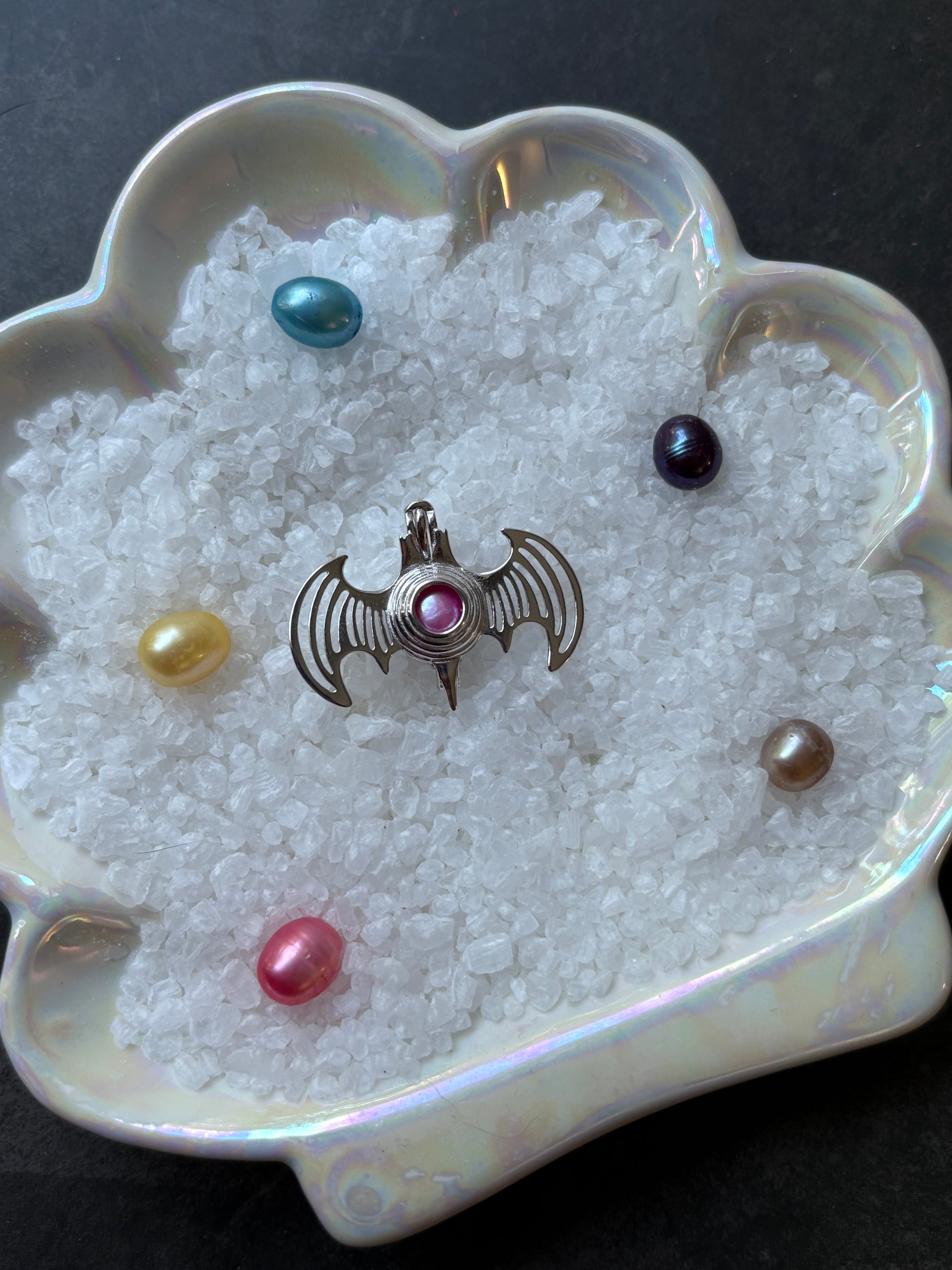 Unleash a little midnight magic with our Pearl-y Batty pendant cage. Crafted from genuine sterling silver, this unique design features outstretched wings ready to cradle your pearl in a spooky-chic embrace. Perfect for Halloween lovers or anyone drawn to the beauty of the night, this cage adds a daring twist to your pearl collection.