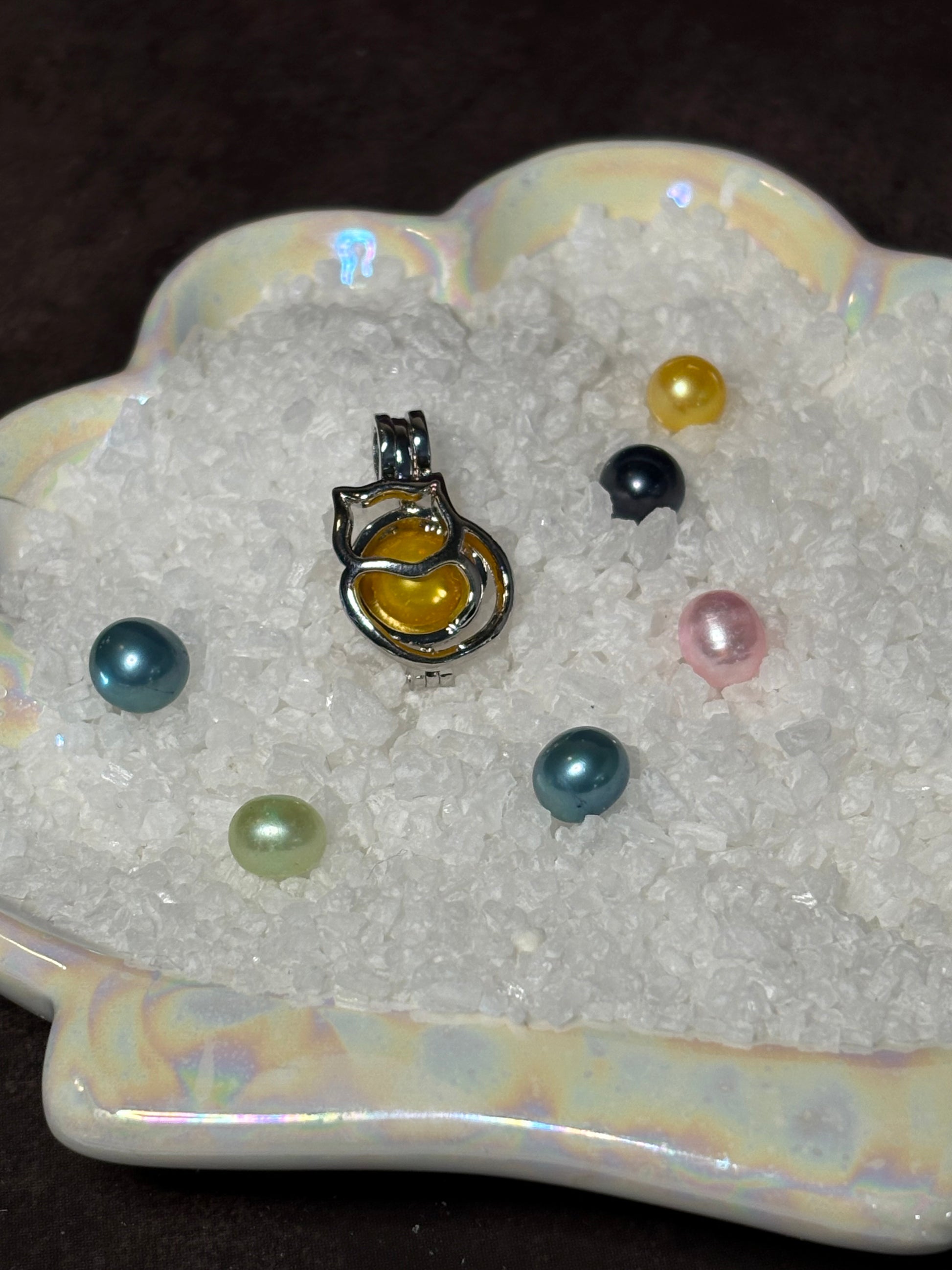 Soft, serene, and full of charm—this purr-fectly cozy cat pendant cage is the purr-fect way to carry a pearl or tiny treasure close to your heart. With its peaceful sleeping pose and detailed design, this pendant captures the cozy magic of a catnap in the sun.
