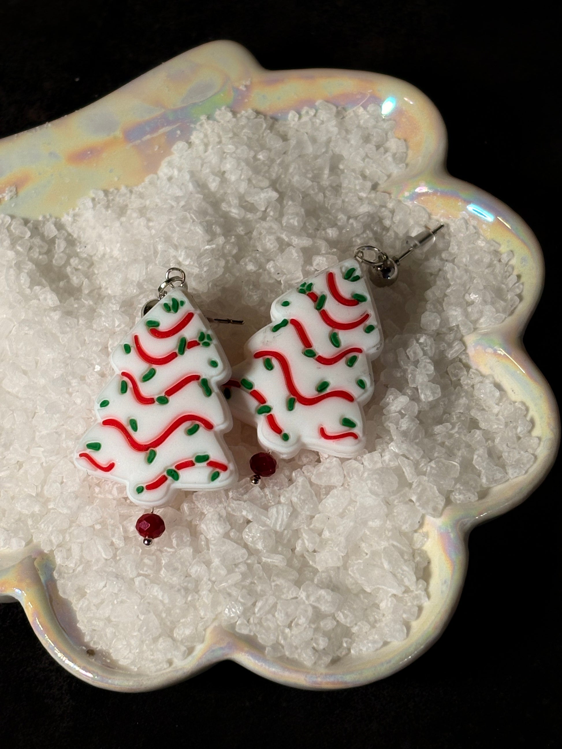 Sweet, sparkly, and full of festive fun—these drop earrings are inspired by the iconic Christmas tree snack cake we all know and love! With charming tree shapes, white “frosting,” red stripes, and colorful sprinkle details, these earrings bring holiday nostalgia to life in the cutest way possible. Lightweight and full of cheer, they’re the perfect accessory for cookie swaps, Christmas parties, or just showing off your holiday spirit.